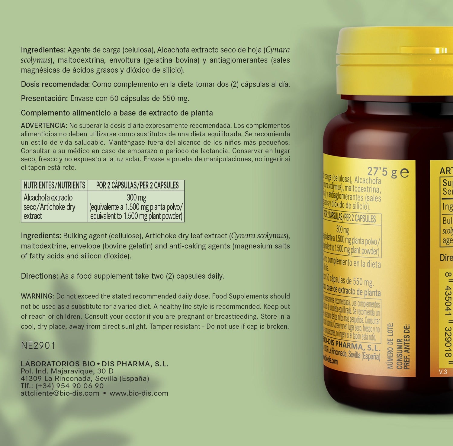 | Alcachofa extracto seco | 300 mg (equivalente a 1.500 mg planta polvo) |