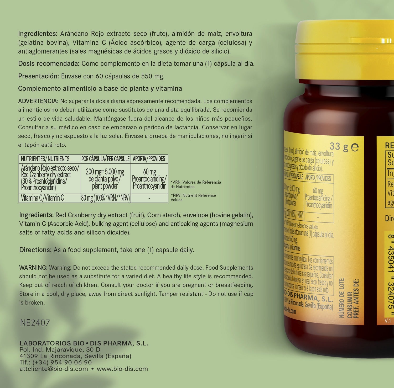 Nutrientes activos: Arándano Rojo extracto seco de fruto (Vaccinium macrocarpon) y Vitamina C (Ácido L-Ascórbico). (Ver ficha técnica)