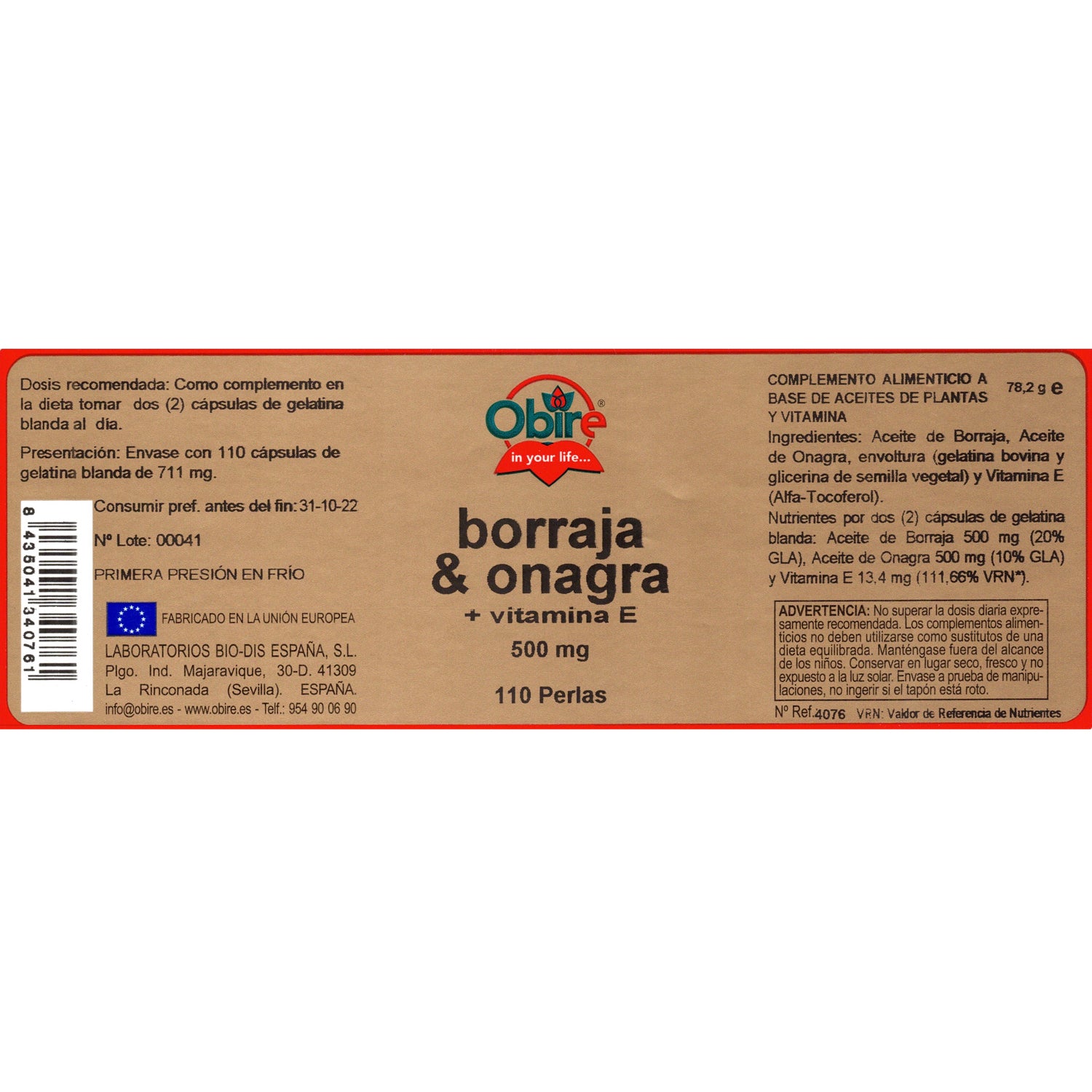 Borraja y Onagra 500 mg perlas de Obire está formulado con Aceite de Borraja y Aceite de Onagra que nos proporcionan ácidos grasos esenciales como los gamma linolénico (GLA) que son precursores de las prostaglandinas, que tienen propiedades antiinflamatorias.